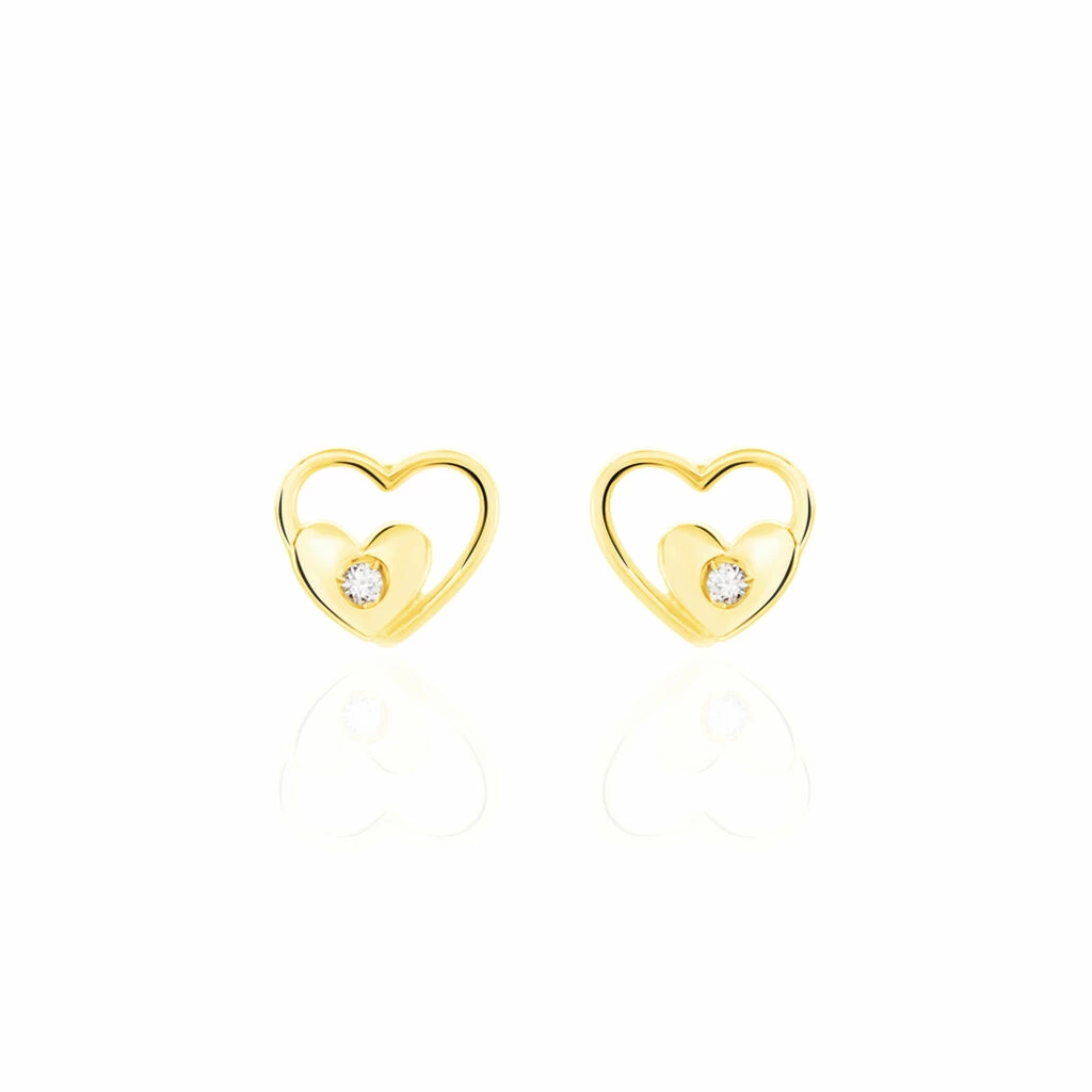 Boucles D’oreilles Or Jaune 375/1000 Cœur Et Oxyde