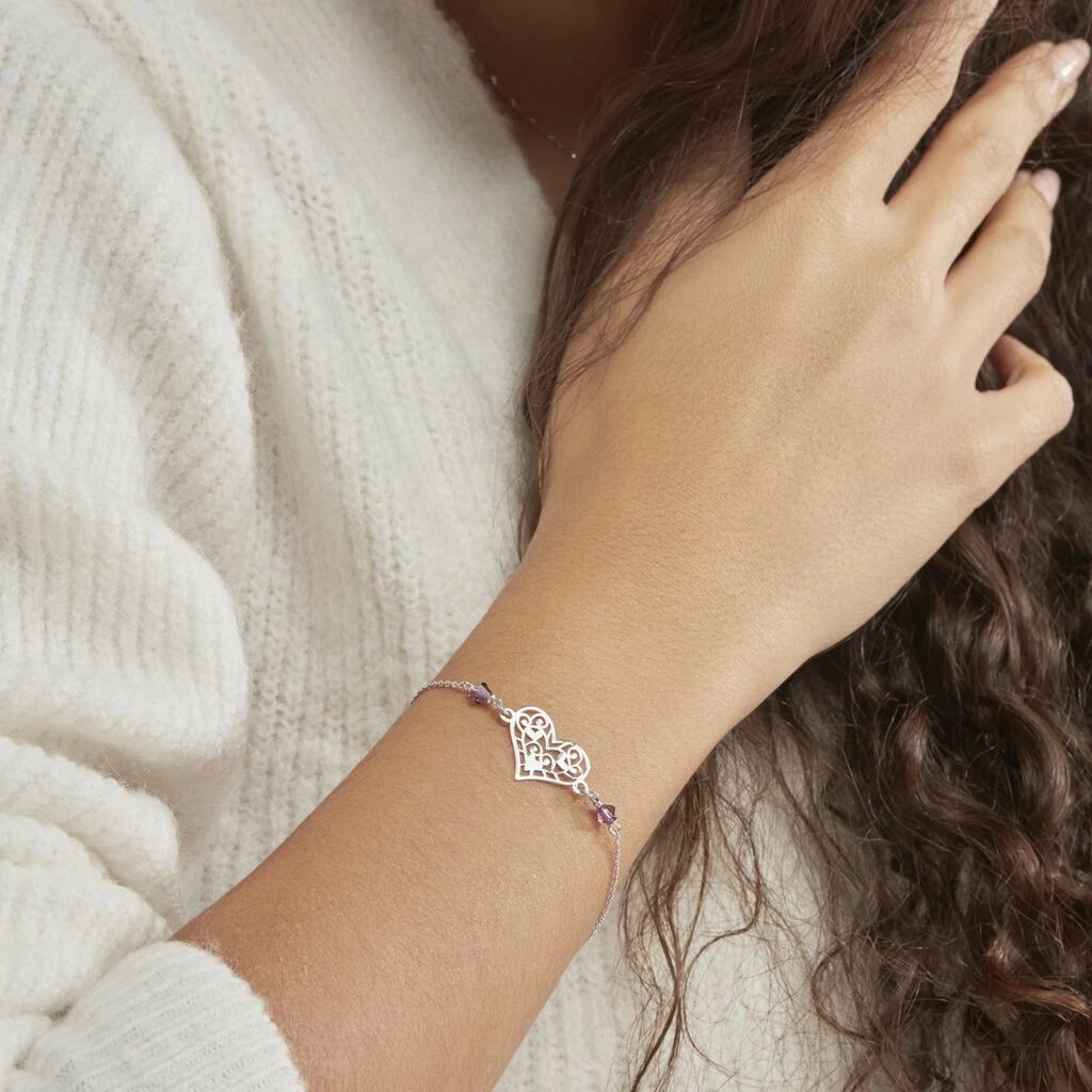 Bracelet Argent Blanc 925/1000 Coeur Pierres Violettes Maille Forcat 18cm