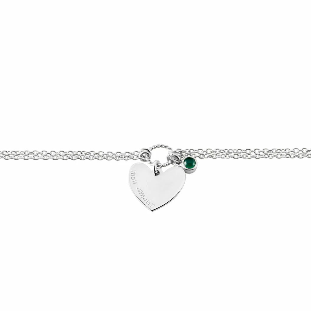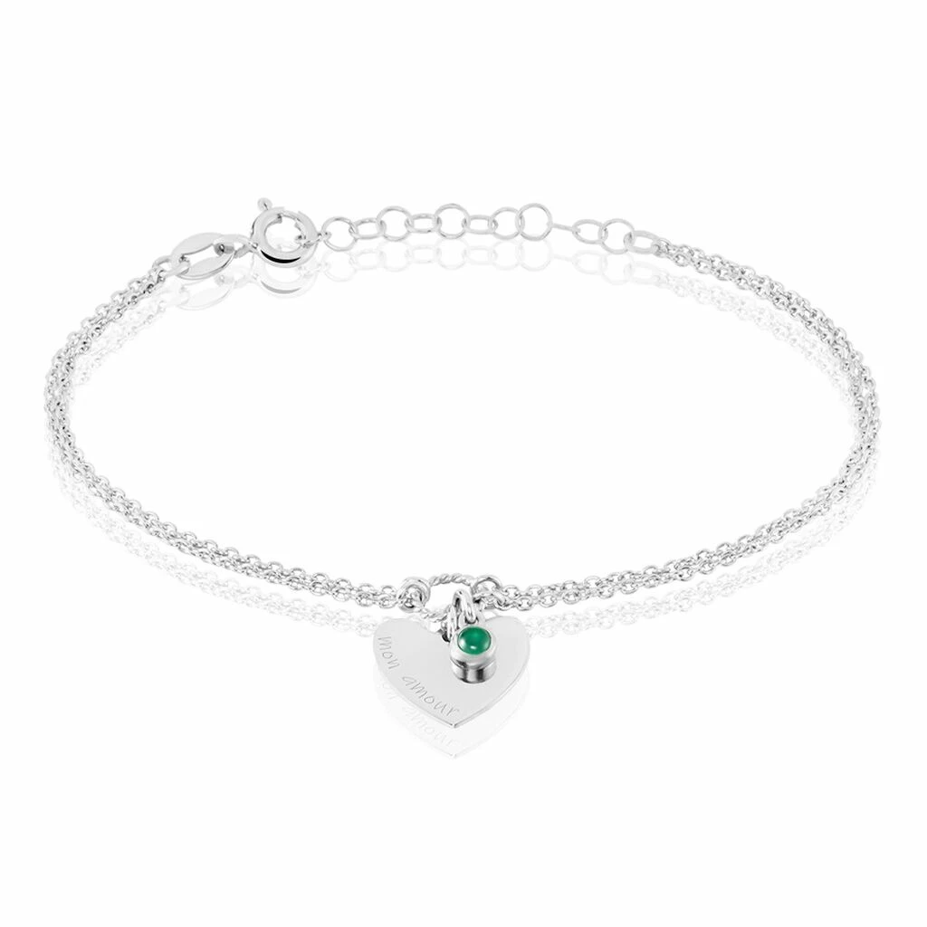 Bracelet Argent Blanc 925/1000 Coeur Message Mon Amour Pampille Onyx Vert Double Mailles Forcat 18.5cm