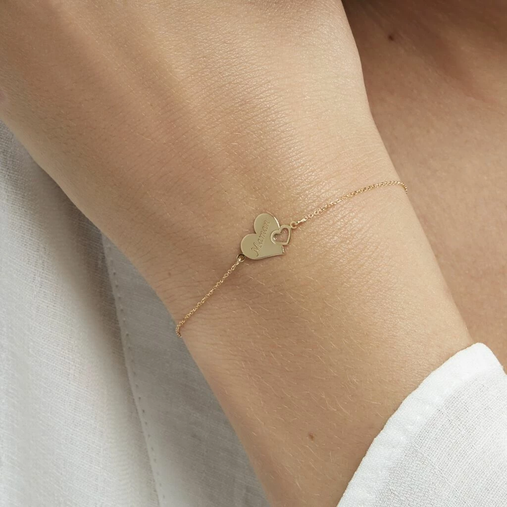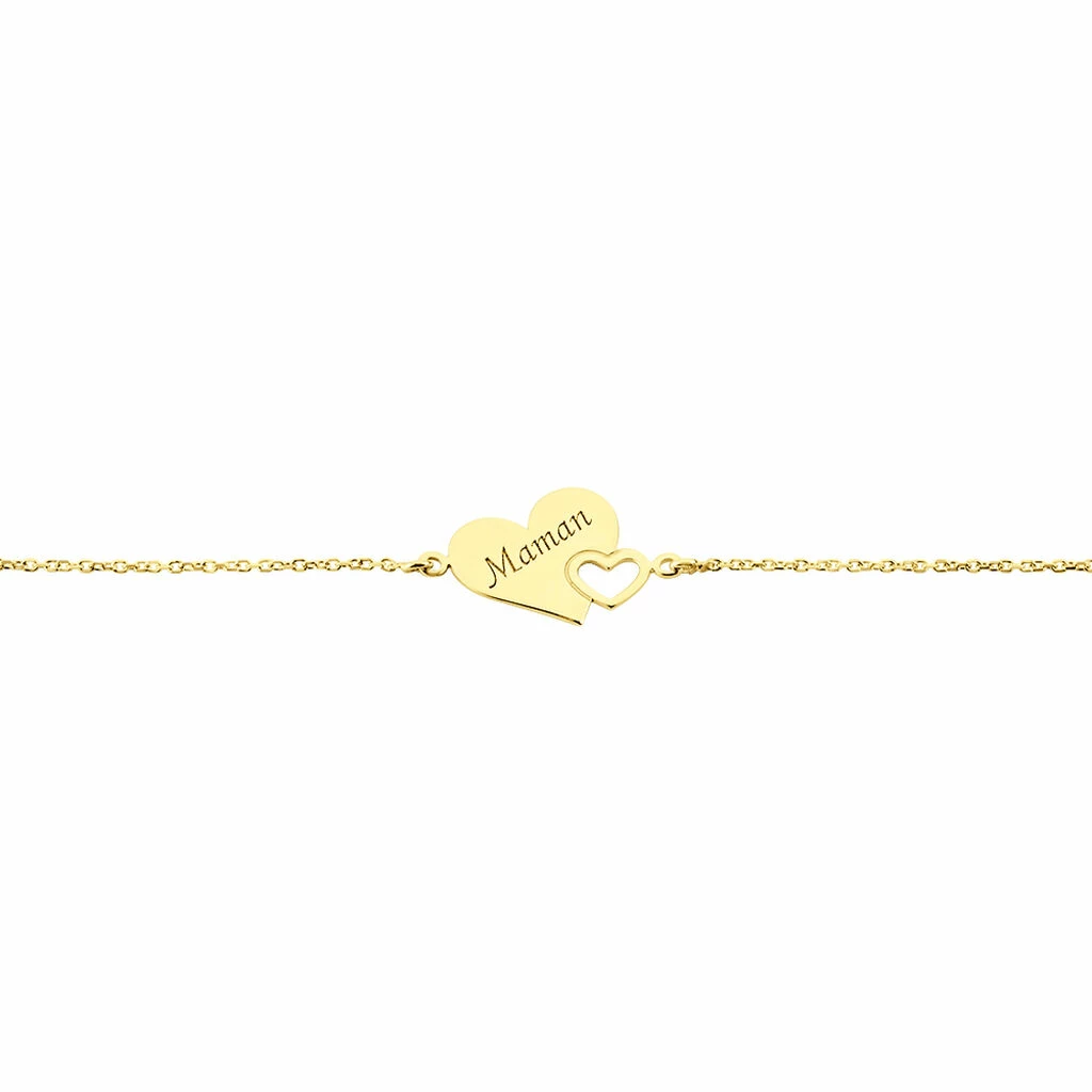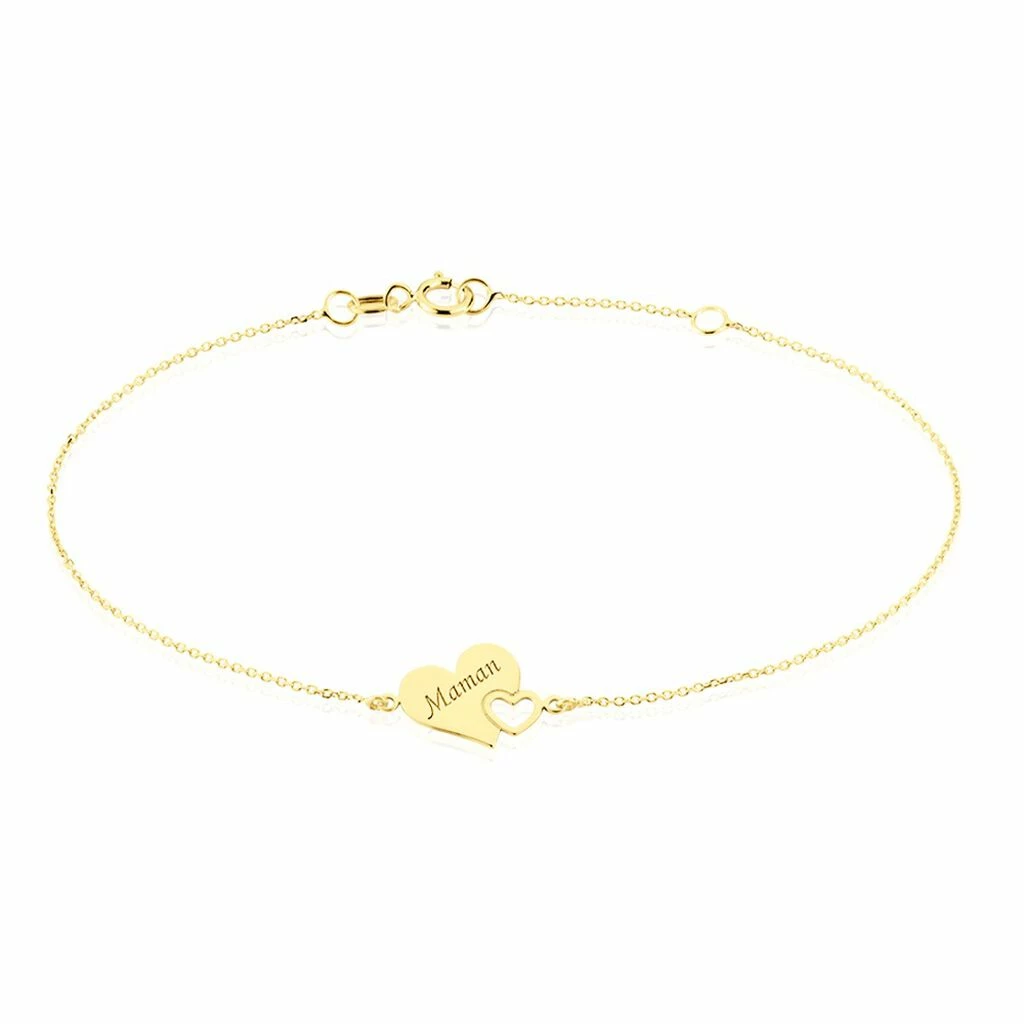 Bracelet Or Jaune 375/1000 Double Coeurs Dont Un Coeur A Message Maman Maille Jaseron 16/18cm