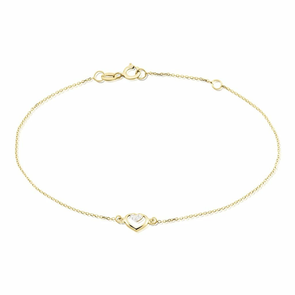 Bracelet Or Jaune 375/1000 Double Coeurs Avec Un Coeur Glitter Silver Maille Jaseron 16/18cm