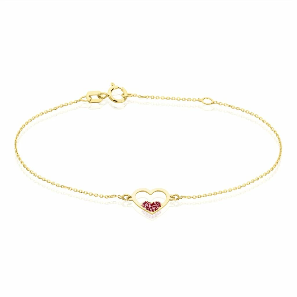 Bracelet Or Jaune 375/1000 Double Coeurs Glitter Rose Maille Jaseron 14/16cm