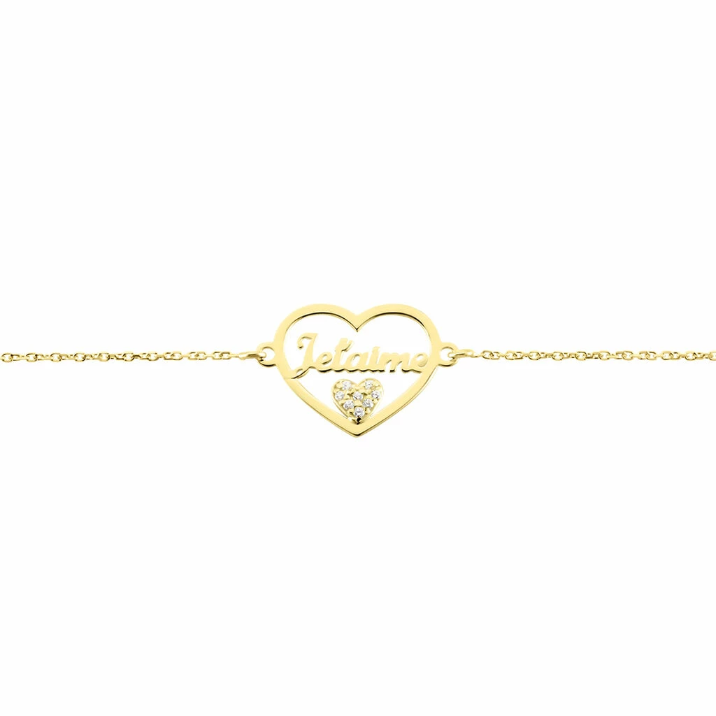 Bracelet Or Jaune 375/1000 Motif Coeur Ajoure Message Je T’aime Coeur Oxyde De Zirconium Maille Jaseron 18cm