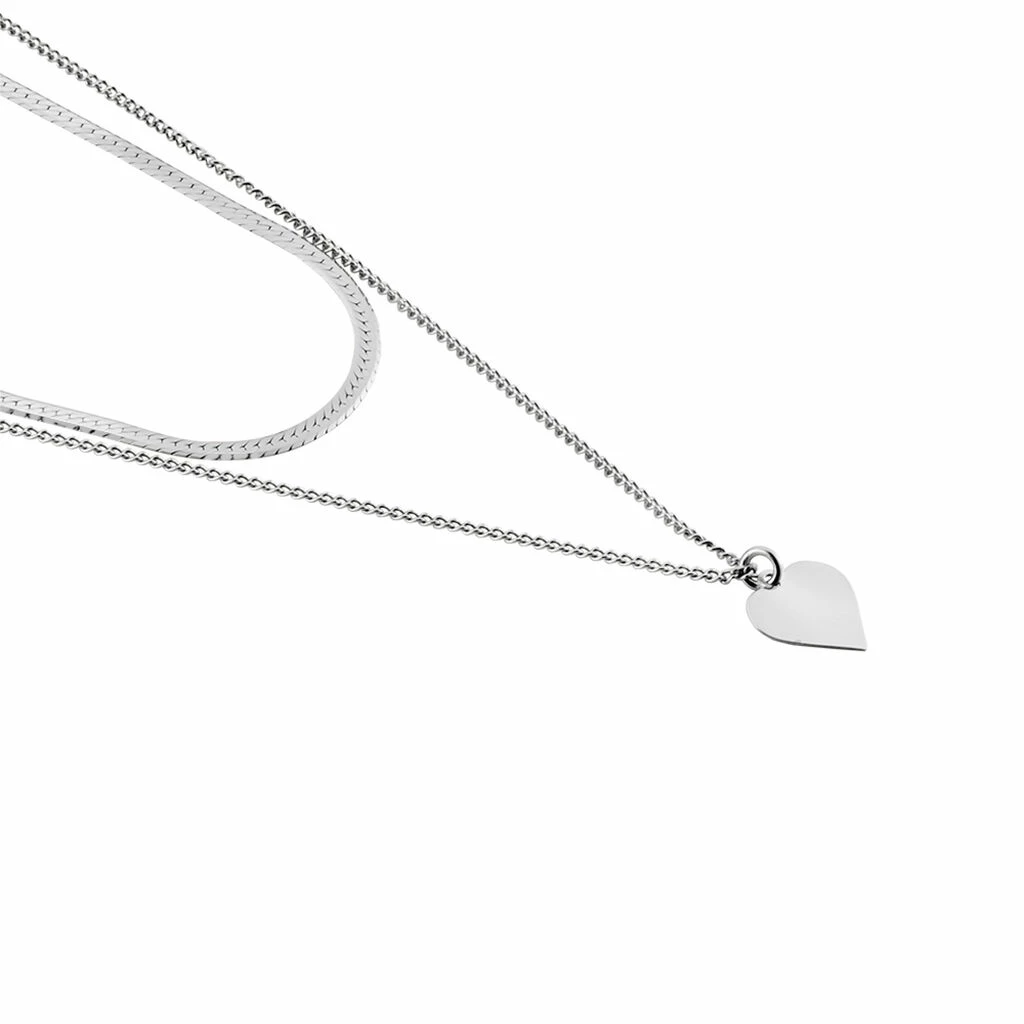 Collier Argent Blanc 925/1000 Cœur Double Chaines Maille Serpent Et Maille Gourmette 45cm