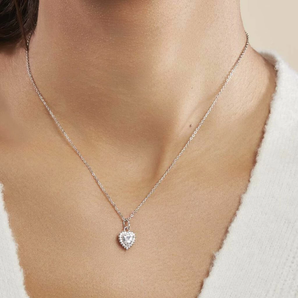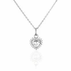 Collier Argent Blanc 925/1000 Pendentif Coeur Avec Oxydes De Zirconium Chaine Maille Forcat 42cm