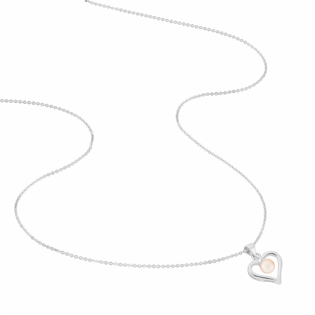 Collier Argent Blanc 925/1000 Pendentif Coeur Et Perle De Culture Rose 6/6.5mm 42cm