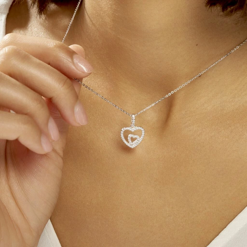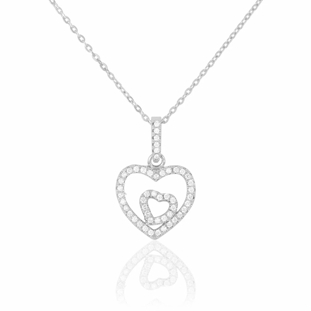 Collier Argent Blanc 925/1000 Double Coeur Ajoure Pavage Oxydes De Zirconium 42cm